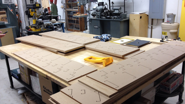 For his installation “Against Nature” at the Sunroom Project Space at Wave Hill, artist Alan Ruiz wanted to construct a system of alternating layers of standard steel studs. Set in front of the large arched windows of the Sunroom, the upright vertical channels needed to be carefully arranged. The CNC router was used to develop the profile shape for each of the different channel sizes that would allow for assembly on-site, but that would still be deep enough to help keep the stud upright. The CNC router was then used to cut a track out of 1″ thick MDF panels that would rest on the floor of the space and serve as the support for the channels. Through his installation Ruiz is able to extract the steel stud both from the wall as well as its typical structural role, creating both a sculptural object as well as a screen regulating the passage of light into and across the space.